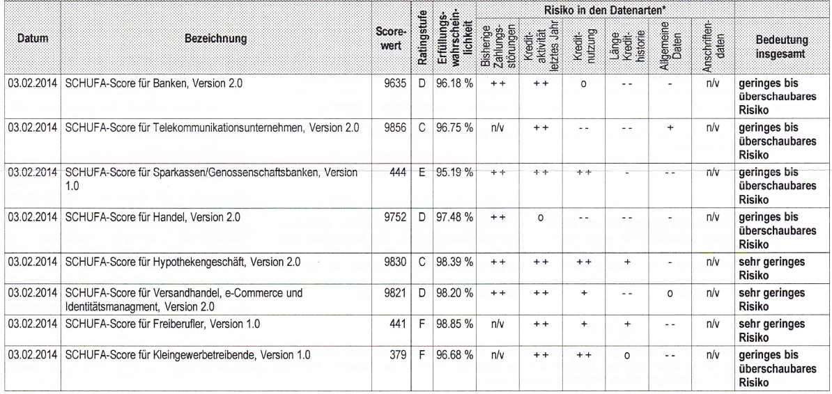Schufa is a German private credit bureau with the objective to protect its clients such as banks or telecommunications companies from credit risks They currently have records on more than 60 million people living in Germany, including foreigners with a German residency. Übermittelte ScoreWerte der vergangenen zwölf Monate Bei diesen Wahrscheinlichkeitswerten erfährst Du, welchen Unternehmen die Schufa in den vergangenen zwölf Monaten eine Bonitätsauskunft über Dich erteilt hat Anders als bei Deinem BasisScore findest Du an dieser Stelle verschiedene Werte für unterschiedliche Branchen und Unternehmen. Der Score einer Person wird in Prozenten angegeben 100 Prozent sind dabei die beste Beurteilung und 0 Prozent die schlechteste In der Praxis werden aber so gut wie nie 100 oder 0 Prozent als Score vergeben Fehler bei den Einträgen der Schufa können zur Folge haben, dass der SchufaScore schlechter ausfällt als er eigentlich sollte.
